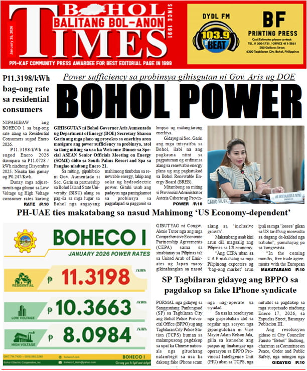 Home TOP NEWS Tagbilaran makes history SINULOG VICTORSTagbilaran makes history SINULOG VICTORS• The BoholTimes • January 25, 2026 Anda marks ‘Dujanon Fest,’ awards ‘mardi gras’ winnersAnda marks ‘Dujanon Fest,’ awards ‘mardi gras’ winners• The BoholTimes • January 25, 2026 Gipahugtan ang seguridad sa Bohol samtang nagpadayon ang ASEAN meetingsGipahugtan ang seguridad sa Bohol samtang nagpadayon ang ASEAN meetings• The BoholTimes • January 25, 2026 Power sufficiency sa probinsya gihisgutan ni Gov. Aris ug DOE – BOHOL POWERPower sufficiency sa probinsya gihisgutan ni Gov. Aris ug DOE – BOHOL POWER• The BoholTimes • January 25, 2026 Aris signs new tourism codeAris signs new tourism code• The BoholTimes • January 25, 2026 Bohol hosts ASEAN summitBohol hosts ASEAN summit• The BoholTimes • January 25, 2026 Tomb raiders in Mabini strike, againTomb raiders in Mabini strike, again• The BoholTimes • January 25, 2026 Lila celebrates 158th birthdayLila celebrates 158th birthday• The BoholTimes • January 25, 2026 New streetlights switched on in Palma Street to enhance public safetyNew streetlights switched on in Palma Street to enhance public safety• The BoholTimes • January 25, 2026 San Isidro welcomes new barangay hall, mini dump truck, and emergency vehicle from city governmentSan Isidro welcomes new barangay hall, mini dump truck, and emergency vehicle from city government• The BoholTimes • January 25, 2026 THIS WEEK FRONT & BACK PAGE THIS WEEK NEWS Share Facebook Twitter Pinterest Linkedin