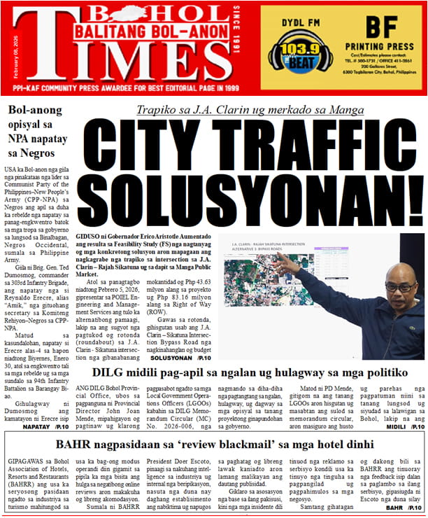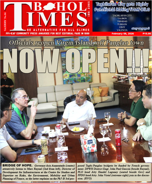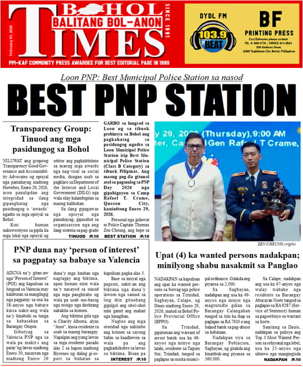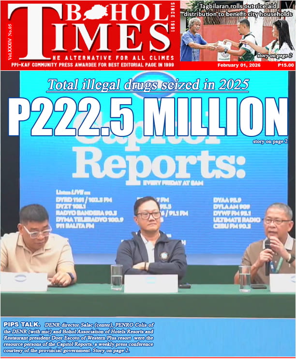 Home TOP NEWS Total illegal drugs seized in 2025: P222.5 MILLIONTotal illegal drugs seized in 2025: P222.5 MILLION• The BoholTimes • February 1, 2026 City recognizes top performing barangays and officials in 2025 Governance AwardsCity recognizes top performing barangays and officials in 2025 Governance Awards• The BoholTimes • February 1, 2026 DOH nag-monitor sa Nipah VirusDOH nag-monitor sa Nipah Virus• The BoholTimes • February 1, 2026 Loon PNP: Best Municipal Police Station sa nasod – BEST PNP STATIONLoon PNP: Best Municipal Police Station sa nasod – BEST PNP STATION• The BoholTimes • February 1, 2026 Banned acts of reviving Virgin island within PIPSBanned acts of reviving Virgin island within PIPS• The BoholTimes • February 1, 2026 Tagbilaran rolls out rice aid distribution to benefit city householdsTagbilaran rolls out rice aid distribution to benefit city households• The BoholTimes • February 1, 2026 Tagbilaran offers free spay, vaccination and more for petsTagbilaran offers free spay, vaccination and more for pets• The BoholTimes • February 1, 2026 Ubay town marks 149th fiesta; BNSC Ubay-ubay fest champUbay town marks 149th fiesta; BNSC Ubay-ubay fest champ• The BoholTimes • February 1, 2026 Tagbilaran makes history SINULOG VICTORSTagbilaran makes history SINULOG VICTORS• The BoholTimes • January 25, 2026 Anda marks ‘Dujanon Fest,’ awards ‘mardi gras’ winnersAnda marks ‘Dujanon Fest,’ awards ‘mardi gras’ winners• The BoholTimes • January 25, 2026 THIS WEEK FRONT & BACK PAGE THIS WEEK NEWS Share Facebook Twitter Pinterest Linkedin