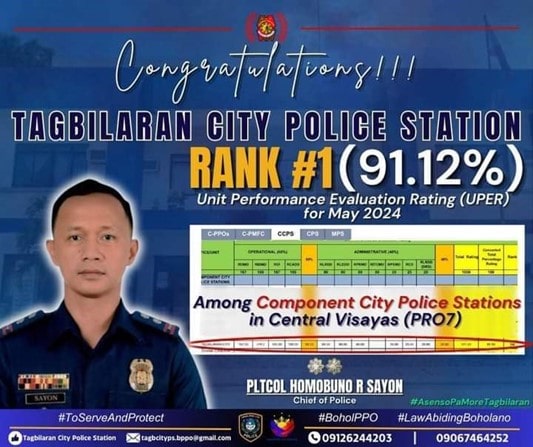 THE Tagbilaran City Police Station has been recognized as the top performer in the consolidated Unit Performance Evaluation Rating (UPER) for May 2024 on June 14, 2024, achieving an impressive overall rating of 91.12%.