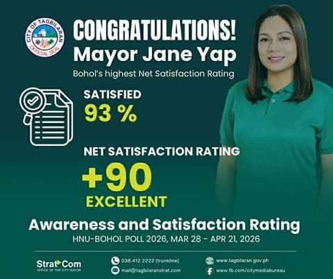 CITY Mayor Jane Yap received an “Excellent” +90 net satisfaction rating in the latest Bohol Poll 2026 conducted by the Holy Name University Center for Research and Publications, with results showing strong public approval of her performance as city mayor.