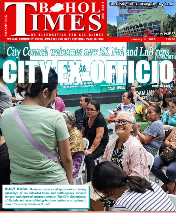 Home TOP NEWS City Council welcomes new SK Fed and LnB reps – CITY EX-OFFICIOCity Council welcomes new SK Fed and LnB reps – CITY EX-OFFICIO• The BoholTimes • January 11, 2026 Town fish landing centers rendered ‘non-operational’Town fish landing centers rendered ‘non-operational’• The BoholTimes • January 11, 2026 Bohol usa sa nag-unang tourist destination – DOT: NUMERO UNOBohol usa sa nag-unang tourist destination – DOT: NUMERO UNO• The BoholTimes • January 11, 2026 Mayor Yap updates Tagbilaranons on Super Mega Health Center progressMayor Yap updates Tagbilaranons on Super Mega Health Center progress• The BoholTimes • January 11, 2026 Police haul P69.9-M worth of ‘shabu’ herePolice haul P69.9-M worth of ‘shabu’ here• The BoholTimes • January 11, 2026 Tagbilaran City streamlines business permits with digital & on-site optionsTagbilaran City streamlines business permits with digital & on-site options• The BoholTimes • January 11, 2026 Butal Ship Hauz: Rising On Dry LandButal Ship Hauz: Rising On Dry Land• The BoholTimes • January 11, 2026 Carmen mayor to donate lots for public cemetery, Science HSCarmen mayor to donate lots for public cemetery, Science HS• The BoholTimes • January 11, 2026 SP honors DepEd, US-based Carmen nurseSP honors DepEd, US-based Carmen nurse• The BoholTimes • January 11, 2026 Rabies ‘major public health risk’ – report: RABIES RISKRabies ‘major public health risk’ – report: RABIES RISK• The BoholTimes • January 4, 2026 THIS WEEK FRONT & BACK PAGE THIS WEEK NEWS Share Facebook Twitter Pinterest Linkedin