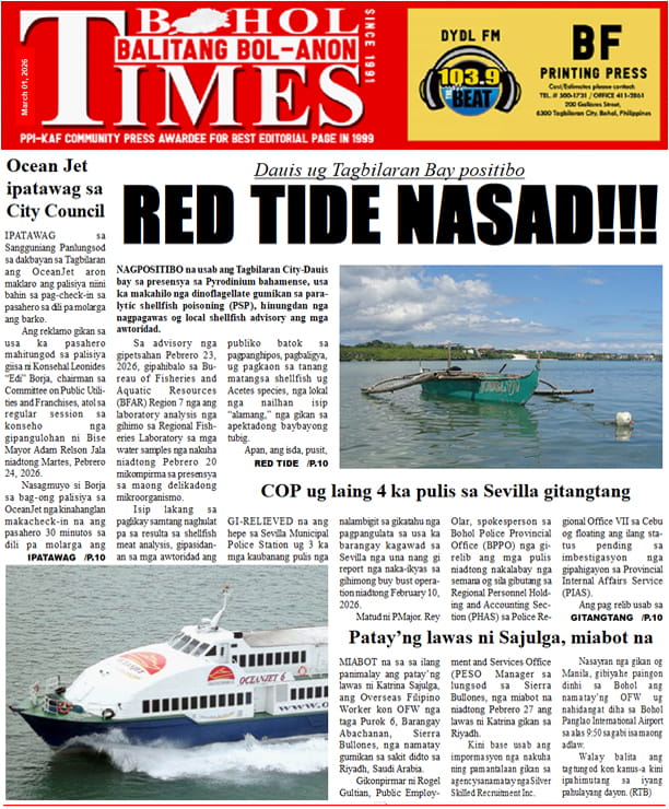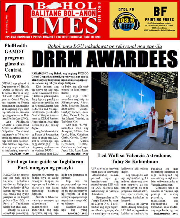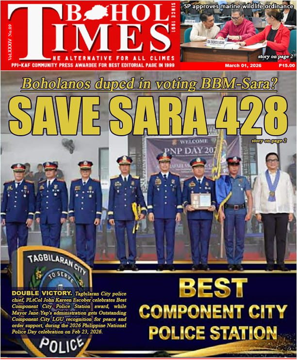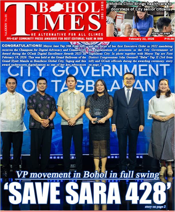 Home TOP NEWS VP movement in Bohol in full swing: ‘SAVE SARA 428’VP movement in Bohol in full swing: ‘SAVE SARA 428’• The BoholTimes • February 22, 2026 SP favors hall of justice building at Banat-i HillSP favors hall of justice building at Banat-i Hill• The BoholTimes • February 22, 2026 Bohol, mga LGU nakadawat og rehiyonal nga pag-ila: DRRM AWARDEESBohol, mga LGU nakadawat og rehiyonal nga pag-ila: DRRM AWARDEES• The BoholTimes • February 22, 2026 Anti-Epal policy is not a law, yet, but… – DILGAnti-Epal policy is not a law, yet, but… – DILG• The BoholTimes • February 22, 2026 Tagbilaran City wins GCash Digital Excellence AwardTagbilaran City wins GCash Digital Excellence Award• The BoholTimes • February 22, 2026 Water for island brgy off Bien-Unido townWater for island brgy off Bien-Unido town• The BoholTimes • February 22, 2026 Medico-legal certificate shows multiple wounds of brgy kagawadMedico-legal certificate shows multiple wounds of brgy kagawad• The BoholTimes • February 22, 2026 Mobile Clinic brings healthcare to doorsteps of City senior citizensMobile Clinic brings healthcare to doorsteps of City senior citizens• The BoholTimes • February 22, 2026 Tagbilaran City’s Disaster Resilience pays off with regional awardTagbilaran City’s Disaster Resilience pays off with regional award• The BoholTimes • February 22, 2026 New Bohol tourism products/sites eyed: NEW SITESNew Bohol tourism products/sites eyed: NEW SITES• The BoholTimes • February 15, 2026 THIS WEEK FRONT & BACK PAGE THIS WEEK NEWS Share Facebook Twitter Pinterest Linkedin
