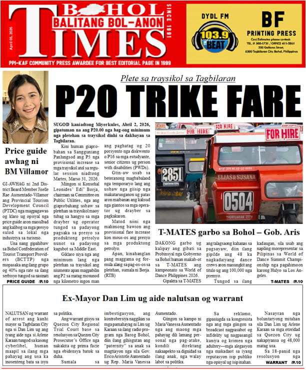 Home TOP NEWS Tagbilaran City forms committee to tackle energy emergency – CRISIS TEAMTagbilaran City forms committee to tackle energy emergency – CRISIS TEAM• The BoholTimes • March 29, 2026 Capitol recognizes Sandugo in Loay as it marks its 461stCapitol recognizes Sandugo in Loay as it marks its 461st• The BoholTimes • March 29, 2026 LMP gustong madali sa DSWD ang tabang sa mga tricycle driver – CASH RELIEFLMP gustong madali sa DSWD ang tabang sa mga tricycle driver – CASH RELIEF• The BoholTimes • March 29, 2026 City’s top-notch health care earns regional recognitionCity’s top-notch health care earns regional recognition• The BoholTimes • March 29, 2026 New bishop for Tagbilaran diocese namedNew bishop for Tagbilaran diocese named• The BoholTimes • March 29, 2026 DoTR’s reducing terminal fees may not be enough – Rep. TutorDoTR’s reducing terminal fees may not be enough – Rep. Tutor• The BoholTimes • March 29, 2026 City free public ride to include privately operated for passengersCity free public ride to include privately operated for passengers• The BoholTimes • March 29, 2026 Tagbilaran city plants mangroves to boost coastal defenseTagbilaran city plants mangroves to boost coastal defense• The BoholTimes • March 29, 2026 Tagbilaran learners showcase brains in 3rd Saulog quiz bee showdown; BWS, HNU emerge as championsTagbilaran learners showcase brains in 3rd Saulog quiz bee showdown; BWS, HNU emerge as champions• The BoholTimes • March 29, 2026 SP to probe bus terminal ‘kidnapping’ incident – KIDNAP PROBESP to probe bus terminal ‘kidnapping’ incident – KIDNAP PROBE• The BoholTimes • March 22, 2026 THIS WEEK FRONT & BACK PAGE THIS WEEK NEWS Share Facebook Twitter Pinterest Linkedin